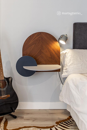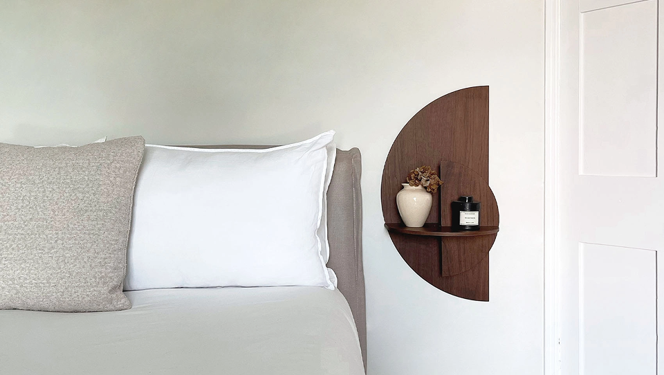 A versatile and modular piece with a sculptural touch that can be used as a wall shelf or as a bedside table.